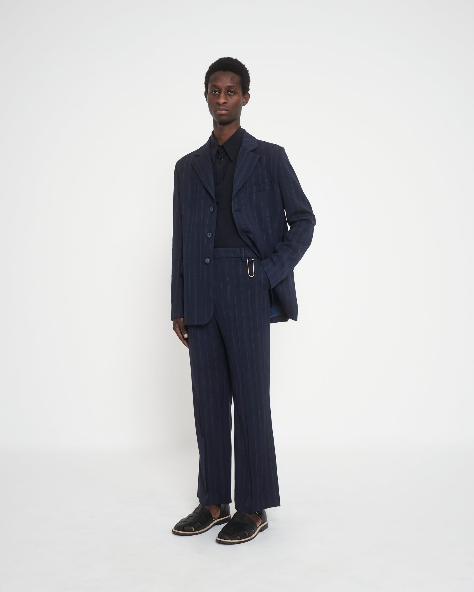 Over-sized single-breasted suit jacket in striped navy-blue cotton. Fully lined. Made in Italy.