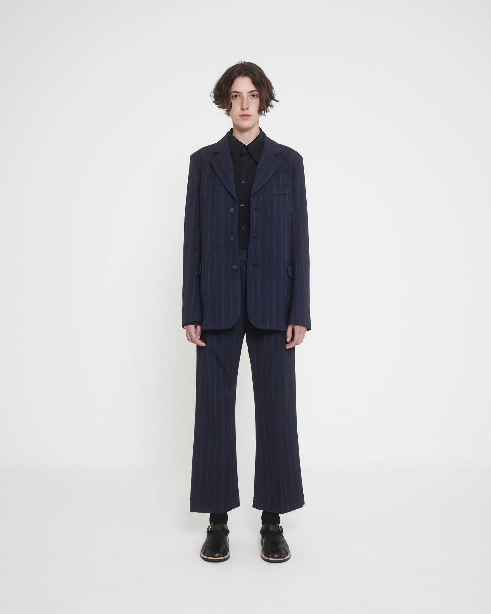 Over-sized single-breasted suit jacket in striped navy-blue cotton. Fully lined. Made in Italy.